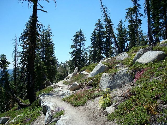 3. 太浩湖区内小径交错繁复。太浩环湖小径 (Tahoe Rim Trail) 长 165英里/265 千米,环绕着太浩湖,沿路最高点达 9,000 英尺/2,743米,风光壮丽,非常适合徒步或山地自行车骑行。