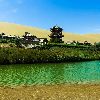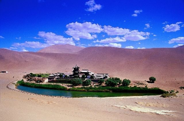 月牙泉位于敦煌市西南5公里处。自汉朝起即为“敦煌八景”之一,月牙泉南北长近100米,东西宽约25米,泉水东深西浅,最深处约5米,弯曲如新月,因而得名,有“沙漠第一泉”之称。