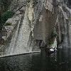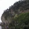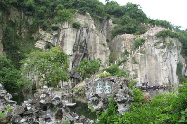 这么大的一个井状石洞,原来是石山的一部分,与自然作斗争的先民,用双手,把这千万吨的青石搬走了,形成这么一个不平凡的景象,真使人惊叹不已。船在洞中徐徐行驶,使人有一种阴森的感觉,但又不同于一般的溶洞。当船贴壁驶过时,用手抚摩一下当年石匠留下的凿痕,看看相当平贴的四壁,仰望那石壁高处突出的巨石,再谛听那从石缝中渗出的水珠滴落湖中的清脆响声,使人有一种神秘的置身于险境的感觉。