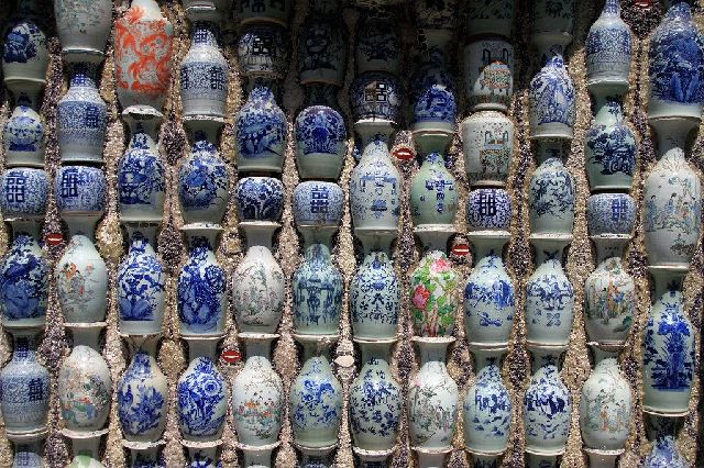瓷房子上镶嵌的7亿多块瓷片涵盖了各个历史时期,有晋代青瓷,唐三彩,宋代钧瓷、龙泉瓷,元明青花,清代纷彩等,几乎官窑、民窑的所有门类都可以在墙上找到,而且都用水泥内部浇注,并用大理石胶粘连固定成为建筑的一部分。