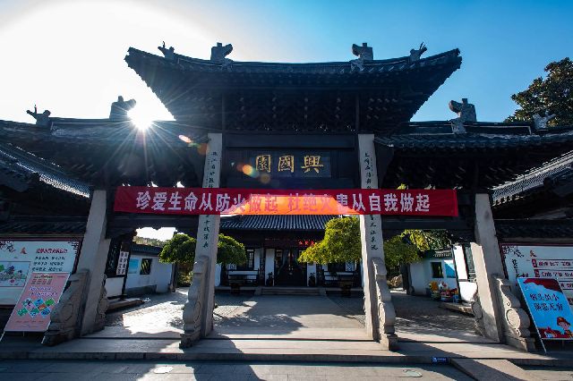 兴国园位于江阴城区中心,为保护园内兴国古塔而建。兴国塔建于北宋太平兴国年间,距今已有千年历史,原是太平兴国教寺的七级浮屠,楼阁式砖木结构, 1925年在军阀混战的“乙丑兵灾”中,兴国塔遭受劫难,塔顶受炮火击中,遂成钢笔尖形。兴国园占地面积2.6万平方米,2002年经重新规划改建,共分为凭吊纪念区、怀古赏景区、诗文化景区三大功能区,其中的广场浮雕最具特色,它记录了明末清初江阴人民英勇抗清的“乙酉屠城”和民国军阀混战时期的“乙丑兵灾”两个历史时期的悲壮场景,体现了江阴人自古以来忠义刚烈的民性传统。兴国园是江阴的一座“城市绿洲”和文化名片。