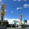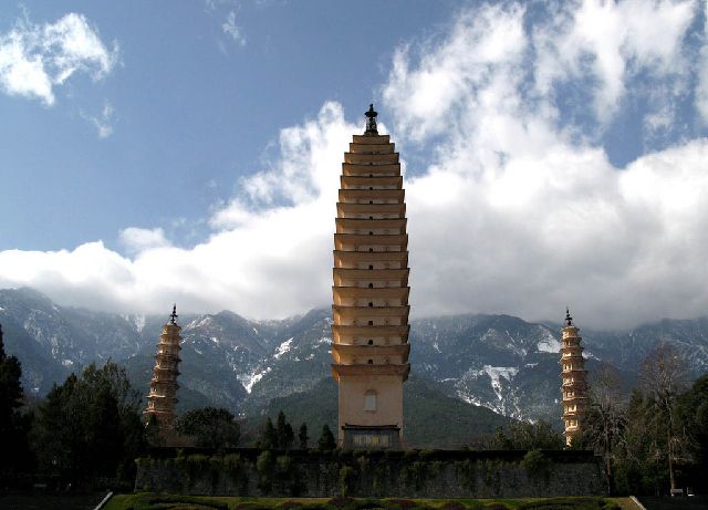 大理崇圣寺,公元713年至741年,经历代扩建,到宋代大理国时期达到了颠峰,有“基方七里,为屋八百九十间,佛一万一千四百尊,用铜四万五百五十斛,有三阁、七楼、九殿、百厦”之规模,享“佛都”之美誉。崇圣寺,东对洱海,西靠苍山,位于云南省大理古城北约一公里处,点苍山麓,洱海之滨。以寺中三塔闻名于世,又称“大理三塔”;是中国著名的佛塔之一,一九六一年被列为国家重点文物保护单位。它似三支巨笔,把古城点缀得更加壮丽,使苍洱风光增添了不少光彩。建于南诏佛教鼎盛时期的大理崇圣寺是当时“妙香古国”的中心,被誉为“佛都”,也是当时东南亚地区最大的佛教寺院和佛教文化中心。其所具有的巨大的历史价值和深厚的文化底蕴使得其斐声海内外,三塔历来都是大理的象征。是旧时崇圣寺(即金庸武侠小说《天龙八部》中所云“天龙寺”)前的建筑,今古刹无存,唯此三塔依然鼎足矗立。三塔是云南现存最古老的建筑物之一,也是在国内享有盛名的塔群。