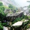 水帘洞入口的这块刻着“朱陵洞天”的巨石,形状既像熊熊燃烧的火焰又像长寿的仙桃,它寓意给人们带来光明、温暖、长寿、幸福,表示吉祥如意,因此又称如意石。水帘洞的标识性建筑是入口处前面那座嵌有“水帘洞”三个鎏金大字的汉白玉石拱龙凤桥,桥身是由两根直径约80公分、高约3米的汉白玉蟠龙石柱支撑的,水从石柱龙口下流过,汇聚而成了桥前的龙口潭。桥两边对称的亭子称为太极龙凤八卦亭。龙凤桥北面群峰叠翠,最高的山峰叫紫盖峰。在南岳72峰中,除紫盖峰外,其它山峰都环拱主峰——祝融峰,呈朝拜状。唐代诗人杜甫曾经写了一首《望岳》诗:“南岳五峰尊,峰峰次低昂,紫盖独不朝,争长业相望。”就是对这个现象的证实。过了龙凤桥,沿着峡谷拾级而上,便有一处刻有草书体的大“奇”字石刻,它是由明代著名书法家董其昌所题写的,可见,水帘洞的奇特景观自古就为世人所传诵。