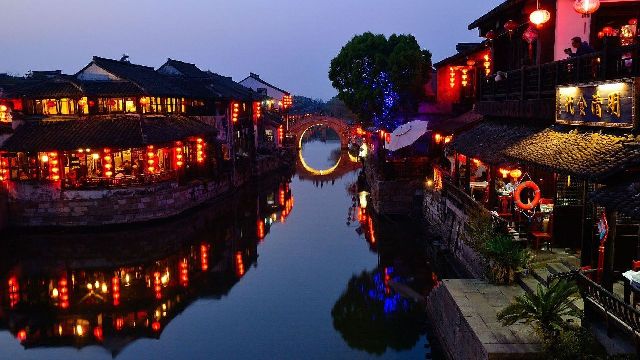 鸟瞰全镇,薄雾似纱,两岸粉墙高耸,瓦屋倒影。傍晚,夕阳斜照,渔舟唱晚,灯火闪耀,酒香飘溢,整座水乡古镇似诗如画,人处其间,恍然桃源琼瑶,不知是人在画中游,还是画在心中移。