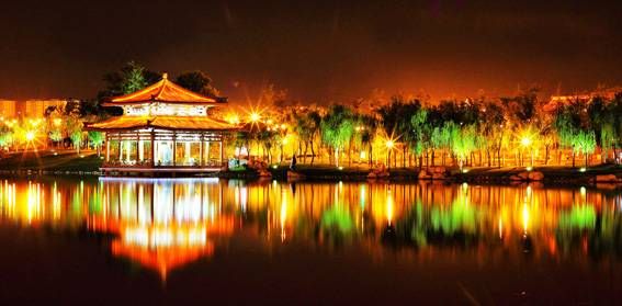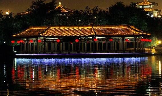1. 在这里散步划船,还能观赏唐代风格的建筑雕塑和陕西风情的手工艺术品。