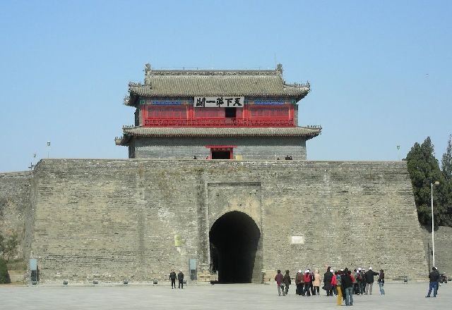 山海关城门外横额书“第一关”,里额书“金陡关”,字迹丰满圆润,苍劲有力,均为清乾隆皇帝爱新觉罗弘历手笔。关隘当险而立,高原夹道,仅容单车,行走五里,视力所及,一线青天。入关经第一寨,始见潼关东门。唐代诗人杜甫有“丈人视要处,窄路容单车,艰难奋长戢,万古用一夫”的诗句,以赞其险。 天下第一关包括山海关城、东罗城以及“天下第一关”城楼、靖边楼、牧营楼、临闾楼等。古城最为增色的是关城东门,天下第一关城楼,耸立长城之上,雄视四野。登上城楼二楼,可俯视山海关城全貌及关外的原野。北望,遥见角山长城的雄姿;南边的大海也朦胧可见。天下第一关城楼南北,还有靖边楼、牧营楼和临闾楼等建筑,展示了中国古代城防建筑风格。